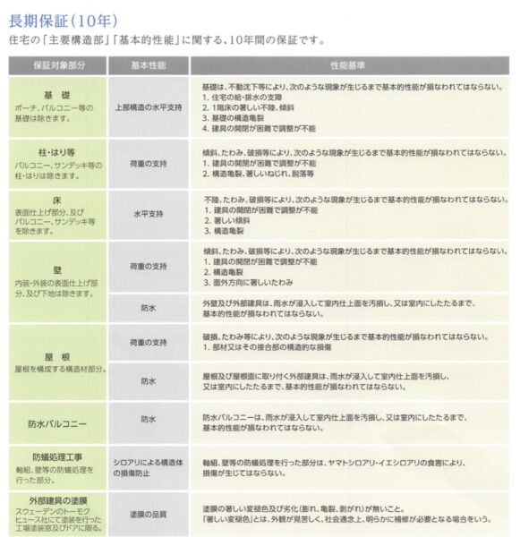 長期保証は住宅の「主要構造部」「基本的性能」に関する部分の保証です。